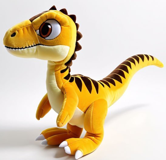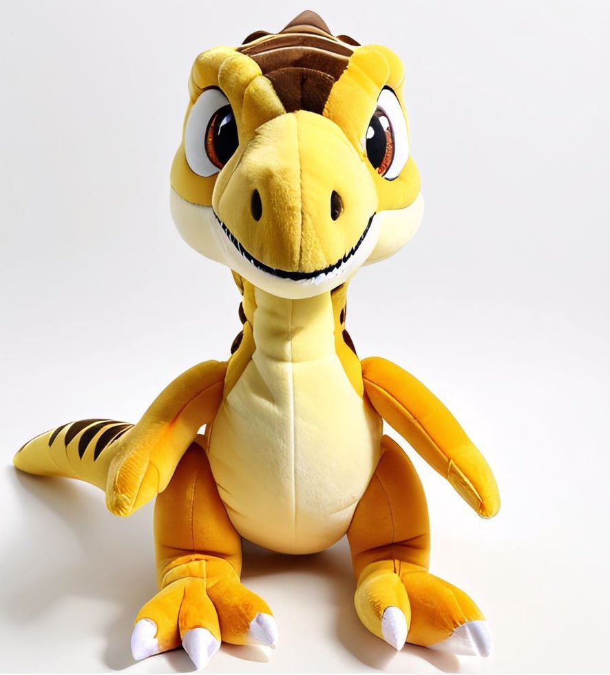 Ten żółty pluszowy dinozaur wyróżnia się szerokim uśmiechem i sympatycznym spojrzeniem. Dzięki swojej wysokości i wyprostowanej sylwetce wygląda jak prawdziwy strażnik dziecięcych przygód.