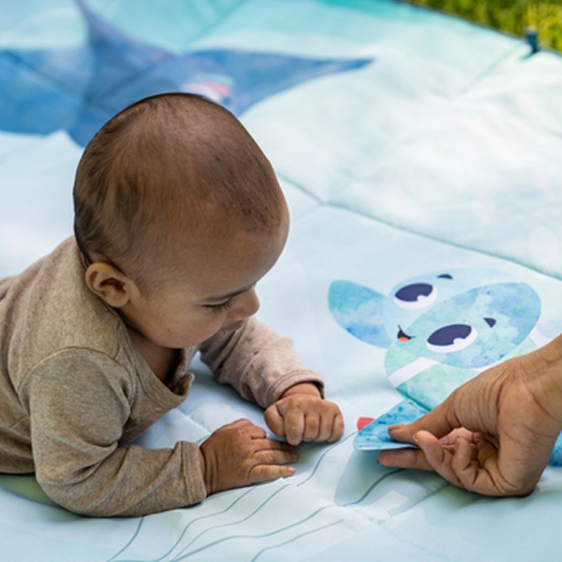 - 0-6 miesięcy: Rozwój motoryki dużej – czas na brzuszku. Pomóż dziecku spędzać więcej czasu na brzuszku, korzystając z różnych elementów na macie. Wskazuj kolorowe ilustracje, baw się szeleszczącymi elementami i satynowymi wstążkami.