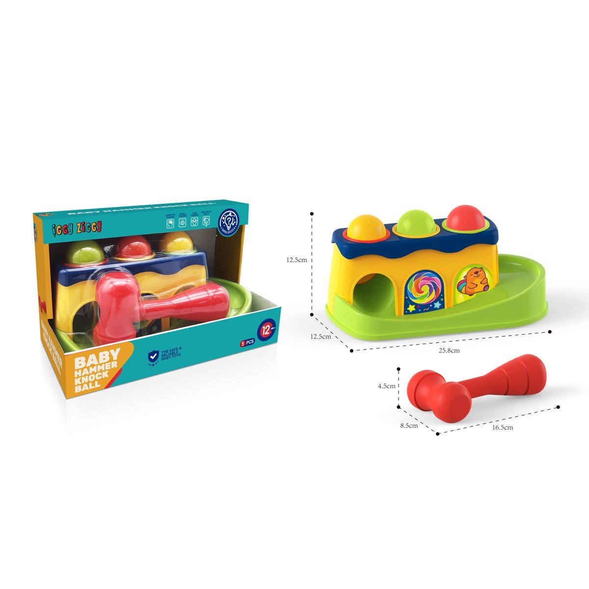 Grzechotka Iggy Ziggy to zestaw rozwojowy dla maluchów. Zestaw zawiera 3 kolorowe piłki, młoteczek i korpus z otworami. Pomaga dziecku rozwijać koordynację ruchową i motorykę małą. Wykonana z trwałego i bezpiecznego plastiku o zaokrąglonych krawędziach. Iggy Ziggy to marka zabawek rozwojowych dla maluchów. Asortyment obejmuje jasne i bezpieczne zabawki, które pomagają dzieciom poznawać świat w zabawny sposób. Produkty marki mają na celu rozwijanie motoryki małej, logiki, koordynacji i percepcji sensorycznej. Wszystkie zabawki Iggy Ziggy są wykonane z wysokiej jakości i bezpiecznych materiałów. Jaskrawy design i interaktywne elementy sprawiają, że każda zabawka jest dla dziecka wyjątkowo ekscytująca.