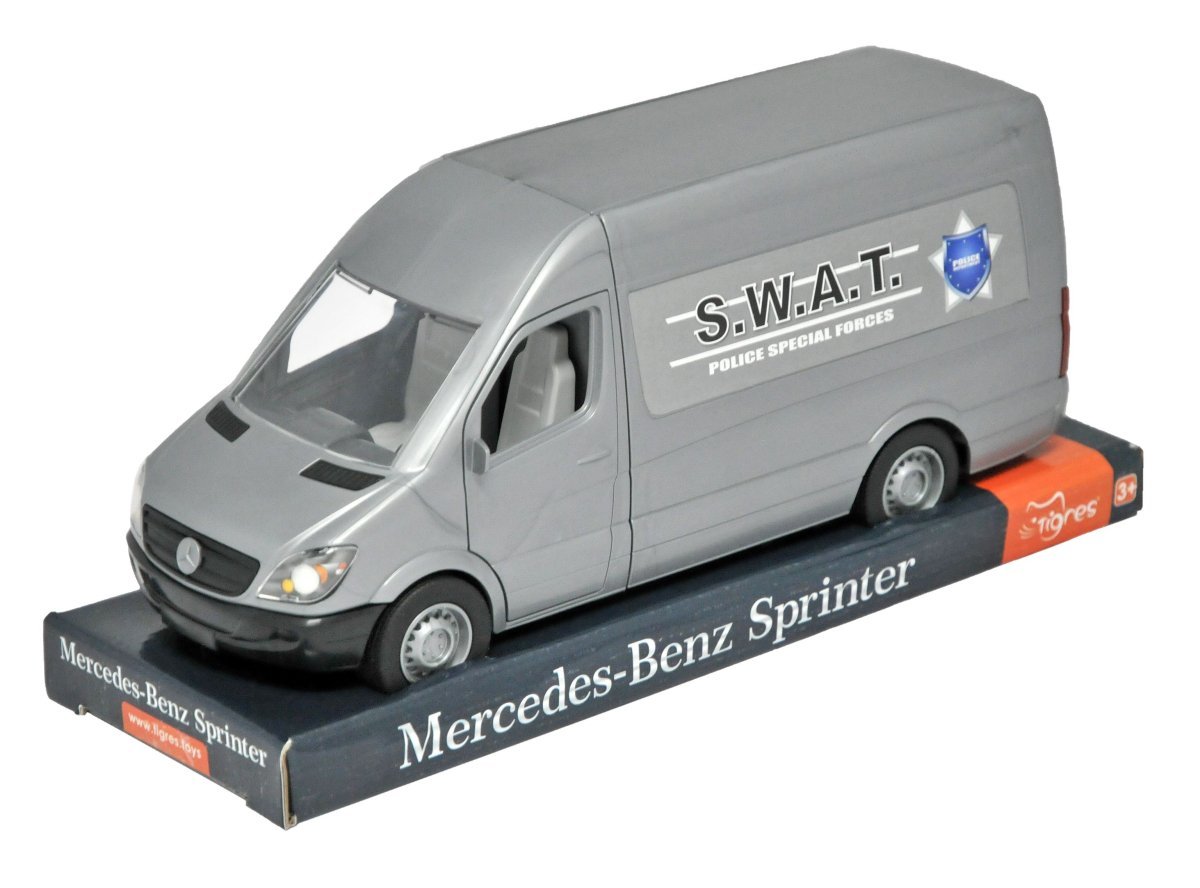Ciężarówka Mercedes-Benz Sprinter (szara) na tablecie, Tigres, to zabawka z licencjonowanej serii samochodów Mercedes-Benz Sprinter w skali 1:24, która nie ma odpowiednika na rynku ukraińskim. Każda zabawka z serii Mercedes-Benz Sprinter jest prototypem słynnych na całym świecie samochodów Mercedes, o czym świadczy hologram z unikalnym numerem na każdym opakowaniu. Model wyróżnia się oryginalnym designem, dbałością o szczegóły i funkcjonalnością. Zabawka sprzyja rozwojowi małej motoryki, wyobraźni przestrzennej, logiki i fantazji. Każdy model posiada ruchome elementy: przednie i tylne drzwi samochodu otwierają się, a kierownica jest podnoszona i opuszczana. Ta zabawka stanie się ulubioną zabawką chłopców w każdym wieku! Dzięki serii samochodów Mercedes-Benz Sprinter młody miłośnik motoryzacji zapozna się z pracą specjalistycznego sprzętu i z jego pomocą będzie mógł symulować różne sytuacje drogowe. Maluchy będą mogły przewozić w samochodzikach ładunki i małe figurki, starsze dzieci – uzupełnią swoją kolekcję aut! Zabawka wykonana jest z bezpiecznego i wysokiej jakości tworzywa ABS, spełniającego ukraińskie i europejskie standardy jakości. Miękkie koła autek pozwalają na łatwe manewrowanie bez poślizgu (wykonane z wysokiej jakości, bezpiecznego tworzywa TPE, o właściwościach mechanicznych zbliżonych do gumy). Seria Mercedes-Benz Sprinter obejmuje następujące modele samochodów: towarowy; osobowy; platforma; przyczepa; laweta; laweta z samochodem wyścigowym; karetka pogotowia; policja. Zalecane dla dzieci w wieku 3 lat i starszych. Materiał produktu – tworzywo ABS. Koła – TPE. Opakowanie – tablet, folia (polietylen).