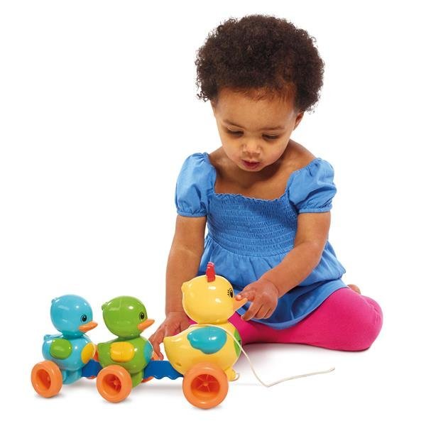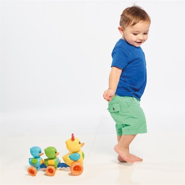 Wózek Toomies Ducks z dźwiękiem E4613. Kaczuszki Toomies z efektami dźwiękowymi zachwycą dzieci od 10. miesiąca życia. Mają wszystko, czego potrzeba, aby bawić i wspierać maluchy w pierwszych krokach. Obserwuj, jak urocze kaczuszki turlają się i kwaczą, podczas gdy dziecko ciągnie je za linę po domu. Wózek uczy związku przyczynowo-skutkowego i zachęca dzieci do chodzenia. Ta zabawka dla maluchów pomaga rozwijać koordynację wzrokowo-ruchową i równowagę. Zabawka wymaga trzech baterii LR44 (w zestawie). Baterie są już dołączone do zestawu, dzięki czemu można od razu rozpocząć zabawę edukacyjną. Wózek Kaczuszki Toomies z efektami dźwiękowymi jest wykonany z wysokiej jakości, wytrzymałego tworzywa sztucznego i spełnia aktualne normy dotyczące zabawek dla dzieci. Toomies to zabawki, które wywołują uśmiech. Firma Dart oferuje szeroki wybór oryginalnych zabawek o ciekawym wzornictwie dla dzieci od 6. miesiąca życia. Zabawki charakteryzują się wyjątkową jakością i bezpiecznymi materiałami, powstałymi we własnym ośrodku badawczym we współpracy z dziećmi i rodzicami.