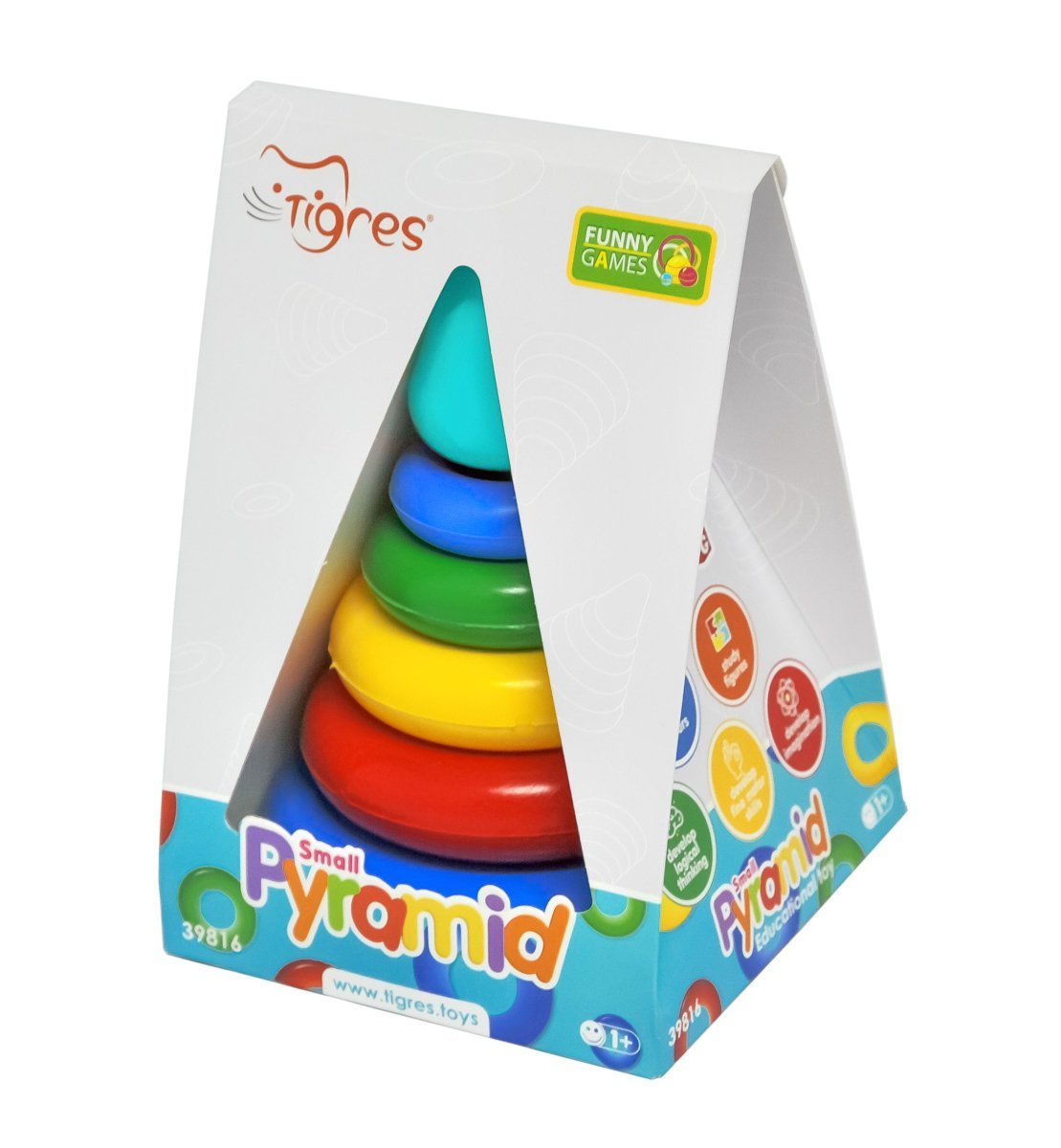 Zabawka edukacyjna „Piramidka” mała w pudełku, Tygrys – przeznaczona jest do wczesnego rozwoju dzieci. Piramida to funkcjonalna zabawka, która wspomaga rozwój małej motoryki rąk, pamięci, uwagi i inteligencji. Zazwyczaj dziecko zaczyna bawić się Piramidą w wieku 6 miesięcy, kiedy próbuje lub już umie siedzieć. Nawlekając kółka na drążek, dziecko rozwija koordynację ruchową, poznaje kolory, uczy się porównywać przedmioty ze sobą, szukać podobieństw i różnic. Zabawa stymuluje rozwój pamięci, mowy i myślenia. Piramida składa się z kółek o różnych rozmiarach i kolorach, nawleczonych na oś z podstawą i nakrętką. Koła piramidy są przyjemne w dotyku i wygodne dla dziecięcych dłoni. Zabawka wykonana jest z bezpiecznych, certyfikowanych materiałów. Zabawka przeznaczona jest dla dzieci od 1. roku życia. Składa się z 7 elementów. Opakowanie – kartonowe.