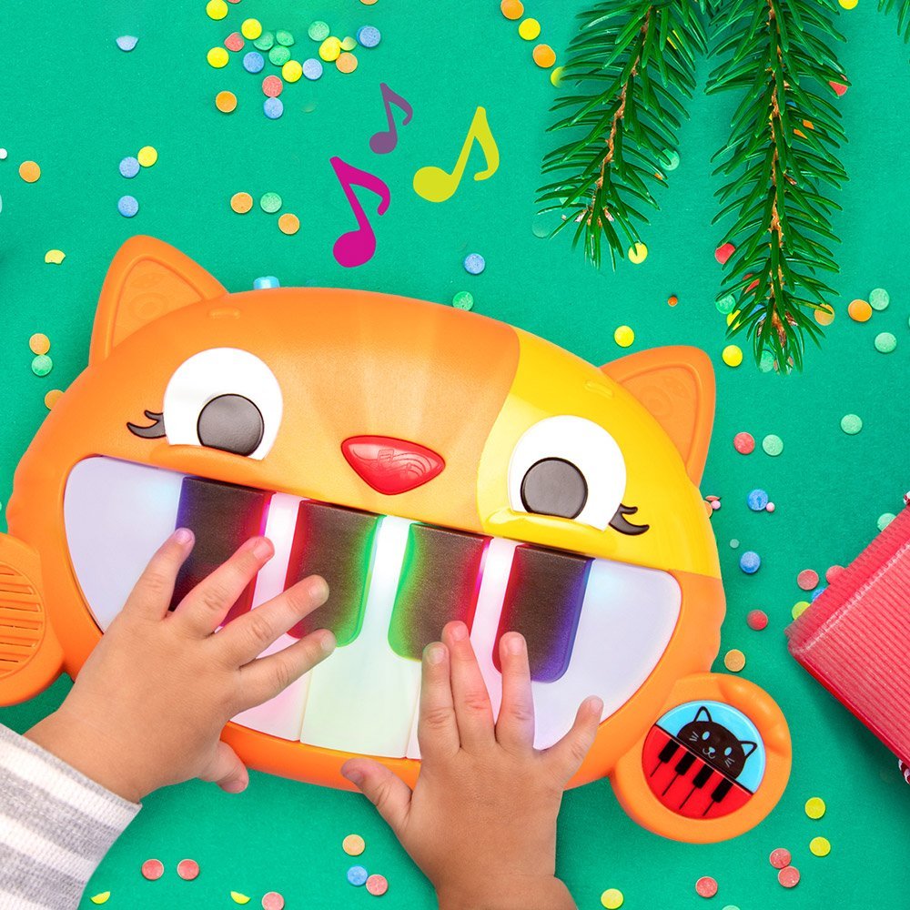 Zabawka muzyczna MINI-CATPHONE wprowadzi Twoje dziecko w świat muzyki. Wraz z zabawnym kotkiem nauka gry na pierwszym pianinie jest łatwa i przyjemna. Możesz też tworzyć zabawne melodie! Zabawka ma 2 tryby gry: dźwięki pianina i dźwięki zabawnego kota! Zabawny kotek gra 10 różnych piosenek. Możesz słuchać i uczyć się grać! 9 dużych klawiszy pianina jest idealnych dla maluchów. A do tego świecą!