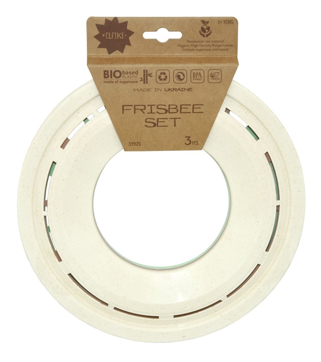 Do Państwa dyspozycji oddajemy nową ekologiczną zabawkę TM ELFIKI – ECO Set „Frisbee” 3 szt., ELFIKI. Podążając za zaawansowanymi światowymi trendami ekologicznymi, firma Tigres, jako pierwsza na Ukrainie, wprowadziła na rynek linię zabawek opartych na surowcach biologicznych. Seria zabawek TM Elfiki natural to właśnie wysokiej jakości zabawki, które zapewnią dzieciom długą radość. Zabawki wykonane są z bioplastiku (polietylenu Green PE TM Braskem) oraz kompozytu drewno-plastikowego (WPC). – W przeciwieństwie do konwencjonalnego polietylenu, Green PE nie jest wytwarzany z ropy naftowej, lecz z trzciny cukrowej. Ekologiczna zabawka TM ELFIKI jest wytwarzana z naturalnych materiałów w sposób przyjazny dla środowiska. Metoda ta nie powoduje emisji dwutlenku węgla, gazów cieplarnianych ani toksyn chemicznych. Mogą one przedostawać się do wód i środowiska. – Biopolietylen (Bio-PE) nadaje się do wytłaczania, formowania wtryskowego i rozdmuchowego i w 100% nadaje się do recyklingu (100% recykling). – Dzięki przyjaznemu dla środowiska polietylenowi Green PE i WPC, wysoka jakość materiału łączy się optymalnie z bezpieczeństwem, przyjaznością dla środowiska i możliwością recyklingu. Zabawki mają pastelowe kolory z drewnianymi drobinkami i przyjemnym, naturalnym zapachem drewna. Produkujemy zabawki bez kleju i śrub. Zabawka jest bardzo łatwa w użyciu. Wystarczy wystrzelić latający spodek, a poleci daleko i szeroko. Zabawka frisbee pomoże dziecku rozwinąć takie umiejętności, jak szybka reakcja, zwinność, zręczność, koordynacja ruchowa, a także poprawi percepcję przestrzenną i przyczyni się do rozwoju fizycznego. Latający spodek stanie się ulubioną zabawką aktywnych i wesołych dzieci, które uwielbiają bawić się na świeżym powietrzu z rodziną, przyjaciółmi i zwierzętami. Frisbee może być również używane jako interaktywna zabawka dla psów wszystkich ras. Nadaje się dla psów, które szczególnie lubią biegać i bawić się zabawkami. Jaskrawy kolor ułatwia znalezienie go w trawie. Zalecane dla dzieci od 1 roku życia. Średnica – 23 cm. Zestaw zawiera trzy dyski w różnych kolorach. Opakowanie: wstążka z tektury kraft. Wybierając ukraińską zabawkę, dbasz o rozwój i przyszłość naszych dzieci!